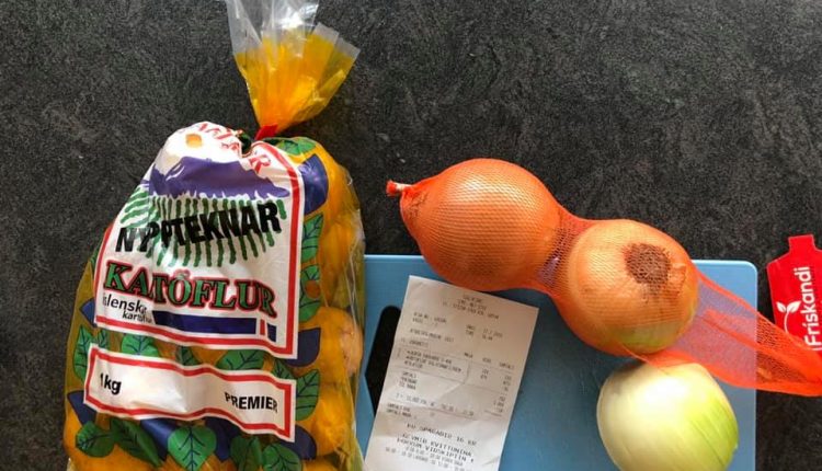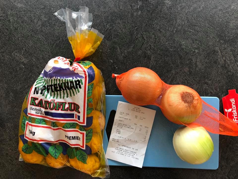 „3 laukar og 12 kartöflur = 782 kr. með KEA afslætti upp á 16 kr.“