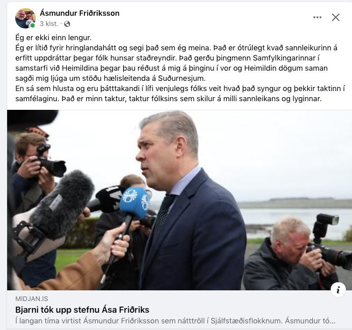 Ásmundur birti færslu Miðjunnar með skrifum sínum. Þar var sagt að á tröppum Bessastaða hafi Bjarni í ræðu sinni sagt í raun að hann fylgdi nýri stefnu í útlendingamálum. Bjarni sótti rok og ræðu í smiðju Ása Hér er frétt Miðjunnar: