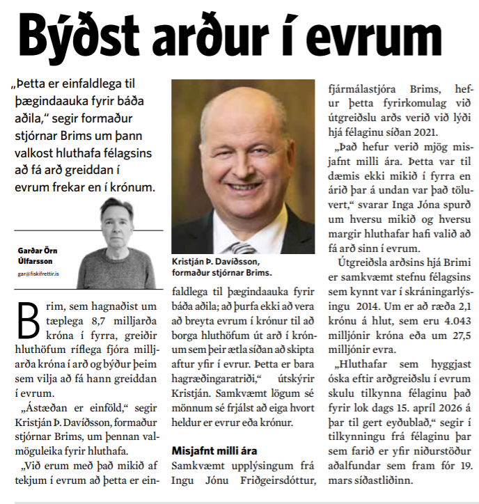 Útgerð: „Brim, sem hagnaðist um tæplega 8,7 milljarða króna í fyrra, greiðir hluthöfum ríflega fjóra millj[1]arða króna í arð og býður þeim sem vilja að fá hann greiddan í evrum.“