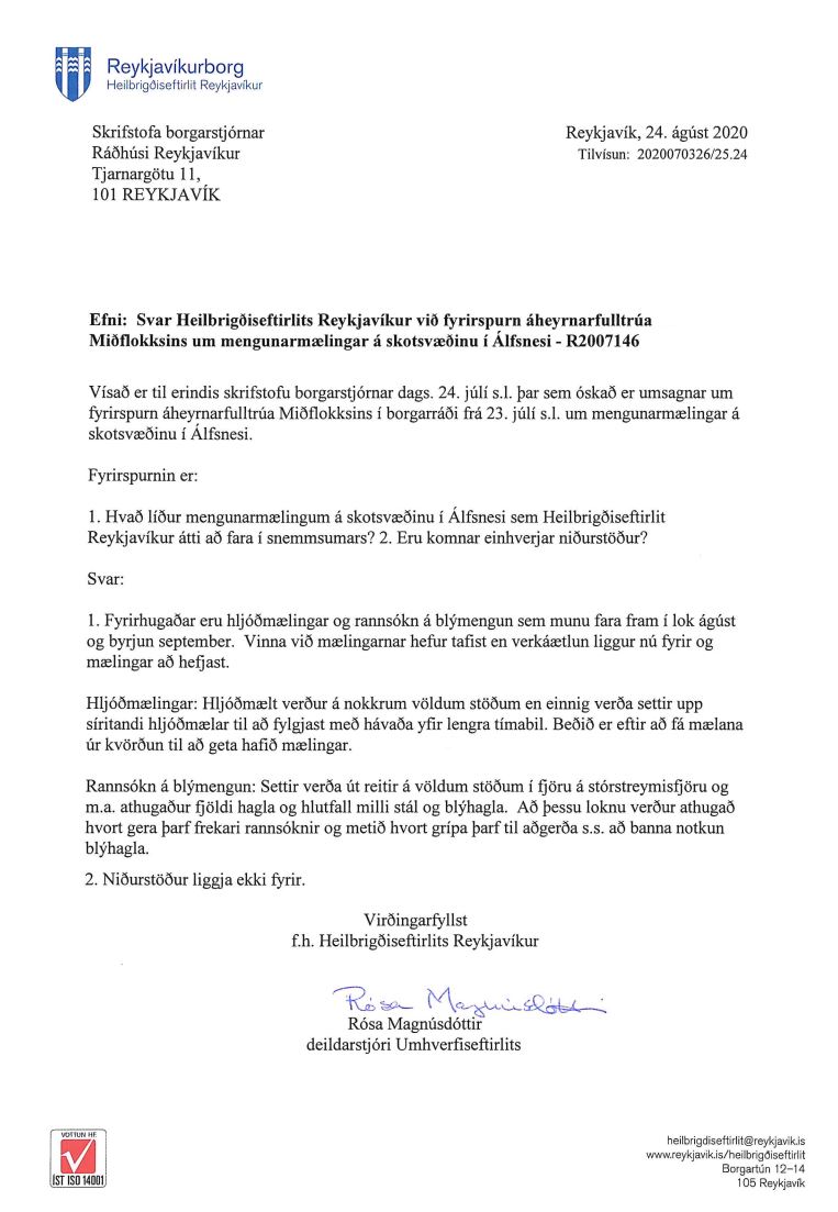 Meirihlutafulltrúarnir benda á á mælingar séu að fara af stað. „Það er mjög sorglegt hvað þessar mælingar hafa dregist – en fara átti í þær snemmsumars. Umkvartanir íbúa eru ekki nýjar af nálinni og ekkert átti að koma á óvart í þessu máli. Nú er boðað að hljóðmælingar og rannsókn á blýmengun fari fram í lok ágúst og byrjun september. Sá tími er nú upprunninn,“ bókaði Vigdís.