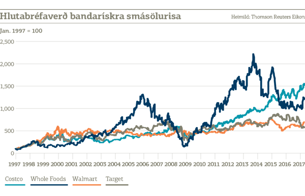 „Costco er næst stærsta smásölufyrirtæki í heimi á eftir Walmart. Alls rekur Costco 732 vöruhús, þar af 510 í Bandaríkjunum og voru heildartekjur samstæðunnar síðustu tólf mánuði 120 ma. USD en það er fimmfalt meira en landsframleiðsla Íslands á síðasta ári. Einn hlutur í Costco á Nasdaq kostar nú 174,7 USD. Hefur hlutabréfaverðið hækkað um 14,7% á ári að meðaltali síðustu 20 ár,“ segir þar ennfremur.