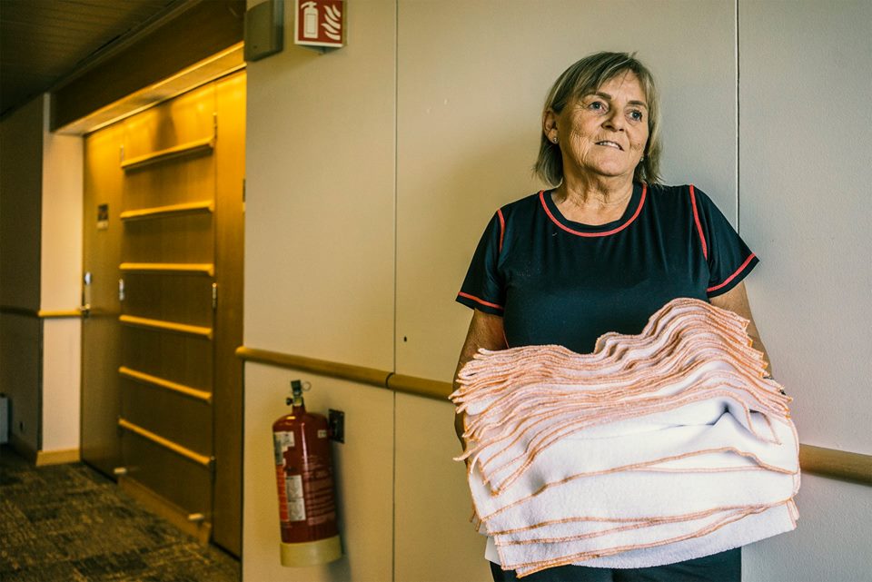 Ég missti svo heilsuna eftir þetta allt saman, ég er bæði gigtarsjúklingur og lungnasjúklingur. Þegar ég var orðin heilsulaus þá bauð hótelið mér þetta saumastarf, þetta er frábær vinnustaður og góður hótelstjóri. Ég nýti allt efni sem er tekið úr umferð. Úr gömlum sængurverum sauma ég jólapoka og þegar þernurnar hafa tíma þá setjast þær hérna hjá mér og lita og teikna á pokana, svo setjum við kex og góðgæti í pokann og hengjum á hurðarhúna gestanna. Ég tek gömul og lúin handklæði, ríf þau í sundur og nota í borðtuskur og gólftuskur, overlokka kantana með sitthvorum litnum, gult í herbergjadeildina, grátt í eldhúsið. Ég sauma líka handklæðapoka og set utan um hausinn á skúringagræjunni í staðin fyrir að nota mopp, við viljum ekki moppa. Moppar eru ekki góð uppfinning, þeir eru bara til að dreifa skítnum og rykinu. Þetta er rosalega góð nýting á öllu lérefti og efnum, ég held að svona endurvinnsla sé einsdæmi fyrir hótel.