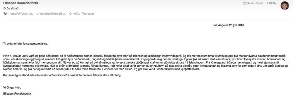 Hinn 1. janúar 2016 varð ég þess aðnjótandi að fá heiðursmerki hinnar íslensku fálkaorðu, fyrir störf að íslenskri og alþjóðlegri kvikmyndagerð. Ég tók mér nokkurn tíma til umhugsunar því margur svartur sauðurinn hefur þegið sömu viðurkenningu og þó ég sé almennt lítið gefin fyrir heiðursmerki, hugsaði ég hlýtt til þeirra sem tilnefndu mig og töldu mig hennar verðuga. Ég tók því að lokum stolt við orðunni, fyrir hönd kynsystra minna í bransanum og fjölskyldunnar sem hefur fylgt mér gegnum allt. Nú var ég að komast að því að nýlega var forseta danska þjóðþingsins afhentur stórriddarakross frá Íslendingum. Pia Kjærsgaard, trúlega hættulegasti og mest sjarmerandi kynþáttahatari norrænna stjórnmála. Hún er orðin stórriddari Íslensku fálkaorðunnar. Það hefur alltaf verið þörf en nú er nauðsyn að taka skýra afstöðu gegn kynþáttahatri og fasisma sem fer sem eldur í sinu um bæði Evrópu og Norður Ameríku og því hef ég ákveðið að senda ykkur til baka mína fálkaorðu. Henni er hér með skilað. Ég get ekki verið í riddaraklúbbi með kynþáttahatara.