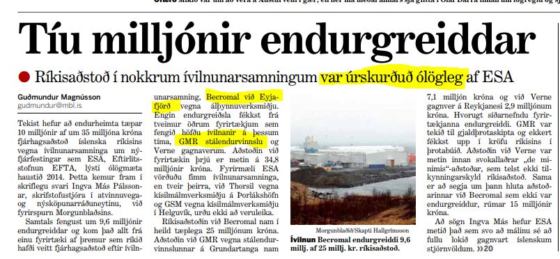 Í Moggafréttinni segir ennfremur: „Sam­tals feng­ust um 9,6 millj­ón­ir end­ur­greidd­ar og kom það allt frá einu fyr­ir­tæki af þrem­ur sem ríkið hafði veitt fjár­hagsaðstoð eft­ir íviln­un­ar­samn­ing, Becrom­al við Eyja­fjörð vegna álþynnu­verk­smiðju. Eng­in end­ur­greiðsla fékkst frá tveim­ur öðrum fyr­ir­tækj­um sem fengið höfðu íviln­an­ir á þess­um tíma, GMR stálend­ur­vinnslu og Ver­ne gagna­ver­um. Aðstoðin við fyr­ir­tæk­in þrjú er met­in á 34,8 millj­ón­ir króna. Fyr­ir­mæli ESA vörðuðu fimm íviln­un­ar­samn­inga, en tveir þeirra, við Thorsil vegna kís­il­málm­verk­smiðju á Þor­láks­höfn og GSM vegna kís­il­málm­verk­smiðju í Helgu­vík, urðu ekki að veru­leika.“