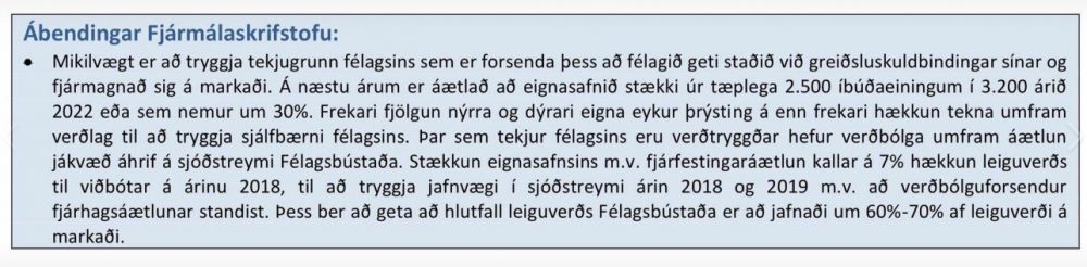 Í árshlutareikningi kemur fram að hækka þurfi leiguverð hjá Félagsbústöðum um 7% til viðbótar á árinu til að tryggja jafnvægi í sjóðstreymi árin 2018 og 2019 m.v. að verðbólguforsendur fjárhagsáætlunar standist. Samkvæmt frekari útskýringum er átt við 2% hækkun að auki við þá 5% hækkun á leiguverði sem hefur nýlega átt sér stað.