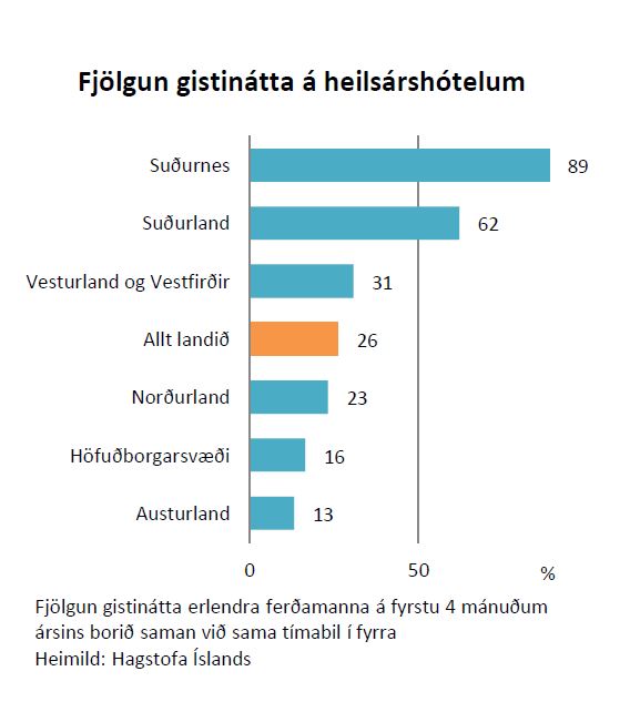 Því fjær sem sem gististaðir eru höfuðborginni fjölgar gistináttum minna. „Þannig var fjölgunin einna minnst á landsvæðum sem eru lengst frá höfuðborgarsvæðinu; Norðurlandi, Austurlandi, Vesturlandi og Vestfjörðum. Fjölgun gistinátta var minnst á Austurlandi, rúm 13% en næstminnst á Norðurlandi eða 23%. Fjölgunin var ívið meiri á Vesturlandi og Vestfjörðum eða tæp 31%. Þessi þróun skýrist að einhverju leyti af því að dvalarlengd ferðamanna hefur verið að styttast á síðustu misserum hér á landi m.a. vegna styrkingar krónunnar sem hefur hækkað dvalarkostnað ferðamanna. Styttri dvalarlengd dregur úr svigrúmi ferðamanna til að ferðast yfir langan veg hér á landi. Þar sem nær allir ferðamenn sem sækja landið heim koma í gegnum Leifsstöð er ljóst að styttri dvalarlengd kemur harðast niður á þeim svæðum sem eru langt frá millilandaflugvellinum. Þetta þýðir einnig að sú styrking sem orðið hefur á krónunni á síðustu misserum og möguleg áframhaldandi styrking til framtíðar mun koma harðar niður á svæðum eins og Austurlandi, Norðurlandi og Vestfjörðum en þeim svæðum sem liggja nær millilandafluginu,“ segir í Hagsjá Landsbanka Íslands.