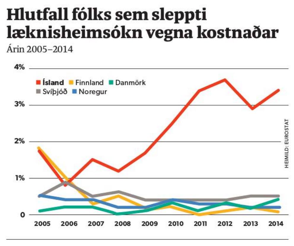 Rætur upprisu almennings gegn auðvaldi og stjórnmálaelítunni sem sinnir erindum þess; má m.a. sjá í þessu grafi. Ef lífskjör hinna verr stæðu á Íslandi og aðgengi þess fólk að heilbrigðisþjónustu væru sambærileg og á hinum Norðurlöndunum þyrftum við að lifa við þá skömm að um 875 manns þyrfti að neita sér um læknisþjónustu vegna fátæktar. Skömm okkar er hins vegar meiri en svo því um 12250 landa okkur eru í þeirri stöðu að eiga ekki efni á að leita til læknis; tekjurnar eru of lágar og gjöldin of há. Á þessum mælikvarða, frá sjónarhóli hinna verst stæðu (sem er eini nothæfi mælikvarðinn) er Ísland fjórtán sinnum verra land en Norðurlöndin.