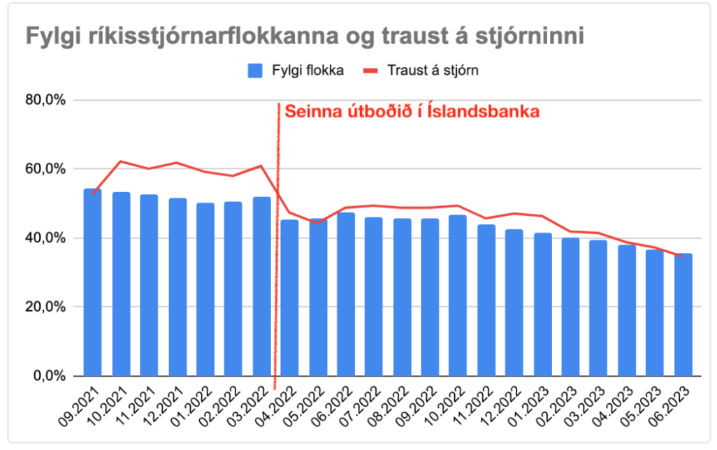 Þarna sést að seinna útboðið í Íslandsbanka var vendipunkturinn. Milli mánaða féll traust á ríkisstjórninni úr 60,9% í 47,4%, fór í fyrsta sinn undir 50%. Samanlagt fylgi ríkisstjórnarflokkanna féll minna, úr 52,1% í 45,5%, en hefur síðan elt minnkandi traust á ríkisstjórninni. Það var þetta mál sem setti ríkisstjórnina í vörn, sem hún hefur ekki kunnað að spila úr, vön óeðlilegum meðbyr og trausti frá cóvidárunum.