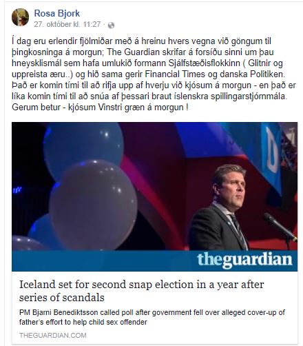 Daginn fyrir kosningarnar skrifaði Rósa Björk Brynjólfsdóttir, oddviti VG í suðvestri, svona: „Í dag eru erlendir fjölmiðar með á hreinu hvers vegna við göngum til þingkosninga á morgun; The Guardian skrifar á forsíðu sinni um þau hneysklismál sem hafa umlukið formann Sjálfstæðisflokkinn ( Glitnir og uppreista æru..) og hið sama gerir Financial Times og danska Politiken. Það er komin tími til að rifja upp af hverju við kjósum á morgun – en það er líka komin tími til að snúa af þessari braut íslenskra spillingarstjórnmála. Gerum betur – kjósum Vinstri græn á morgun!“