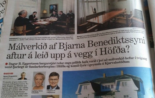 Morgunblaðinu rennur blóðið til skyldunnar og segir í dag: „Ljósmyndin sem birt var á forsíðu Morgunblaðsins mánudaginn 13. október, 1986, að afloknum leiðtogafundinum, var tekin af ljósmyndara Hvíta hússins. Hún sýnir þá Gorbachev og Reagan í fundarherberginu í Höfða og að baki blasir við málverk Svölu Þórisdóttur Salman af Bjarna Benediktssyni heitnum, fyrrverandi forsætisráðherra og borgarstjóra. Þessi ljósmynd varð heimsmynd með því að birtast í öllum helstu fjölmiðlum heims, sjónvarpi, dagblöðum og tímaritum.“