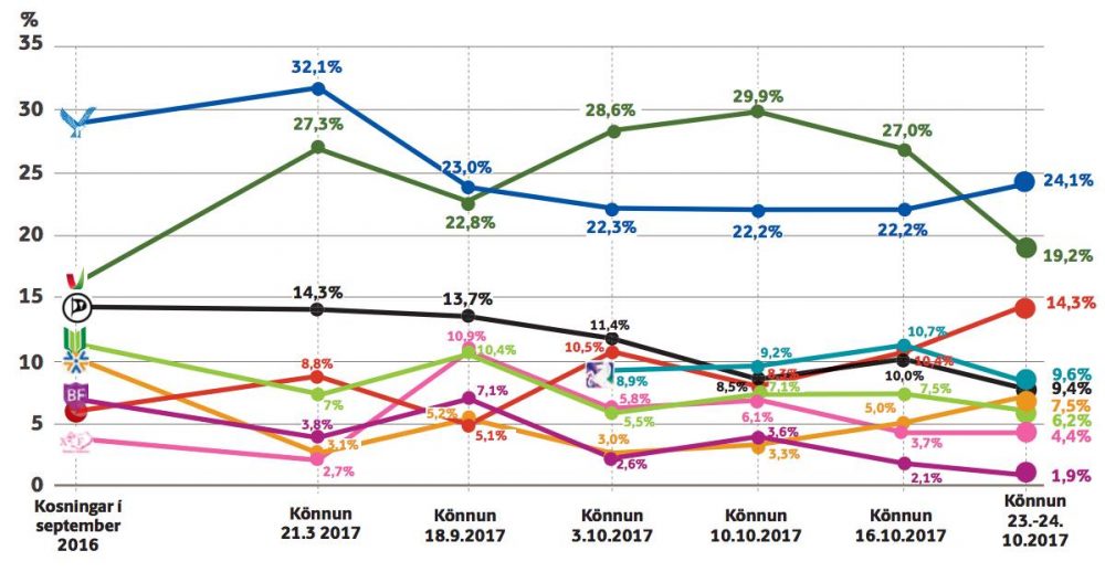 þingmenn eða veikrar mið-vinstristjórnar með 34 þingmenn (VG, Samfylking, Píratar og Framsókn). Ef Viðreisn kæmi inn í stað Framsóknar væri stjórnin með 35 þingmanna meirihluta. Svo má nefna miðjustjórn án Sjálfstæðisflokks og VG; það væri þá fimm flokka stjórn með Samfylkingu, Miðflokki, Pírötum, Viðreisn og Framsókn með 33 þingmönnum.