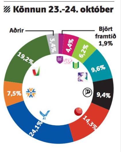 „Samkvæmt nýrri og stækkaðri könnun Fréttablaðsins hefur Samfylkingin, Viðreisn og Sjálfstæðisflokkur verið að bæta við sig fylgi á lokametrum kosningabaráttunnar en VG að missa frá sér fylgi. Það er engin vinstristjórn lengur í þessum spilum og ekki heldur tveggja flokka stjórn VG og Sjálfstæðisflokks. Valið mun standa á milli veikrar fjögurra flokka hægri stjórnar (Sjálfstæðisflokkur og Viðreisn með Miðflokki og Framsókn) með 33