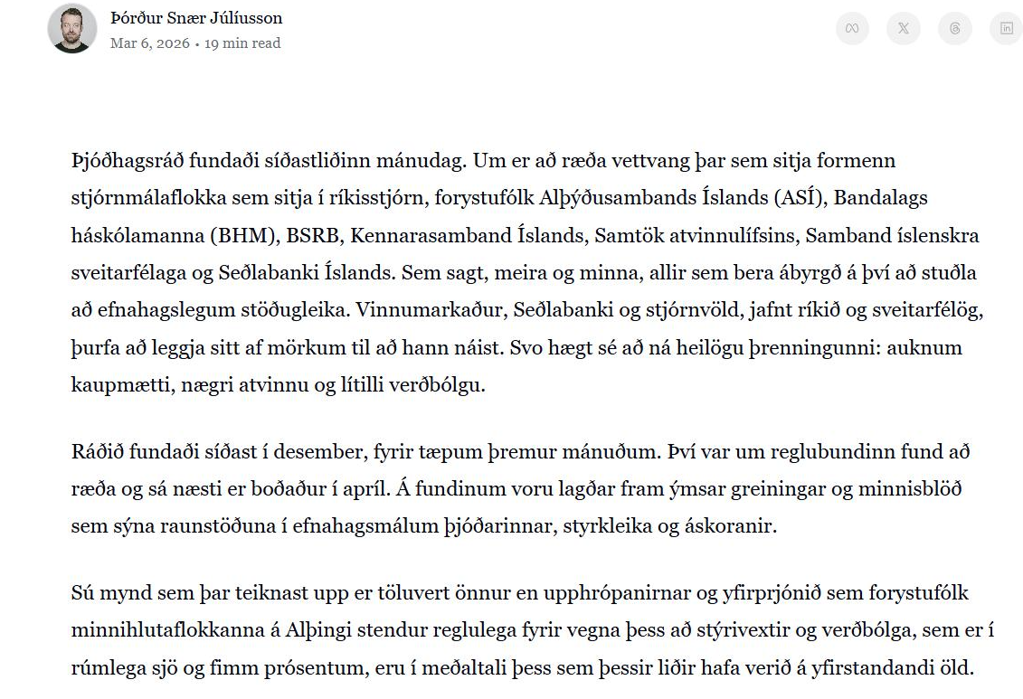 „Þórður Snær Júlíusson sem áður var með þann góða miðil Kjarnann (þar birtist m.a. ágætlega áhugaverður greinaflokkur, þó ég segir sjálf frá, eftir mig um stöðu og vandamál íslenskrar verkalýðshreyfingar), skrifar nú reglulega úrskýringa/varnar/áróðurspistla fyrir stjórnvöld, sem ég skoða stundum. Í þeim nýjasta fer hann yfir „ótrúlega áhugavert“ minnisblað lagt fram á fundi Þjóðhagsráðs í síðustu viku. Þar kemur fram það sem Þórður kallar áfellisdóm yfir hagstjórn fyrri ríkisstjórnar, að hagvöxtur frá árinu 2018 á mann hefur enginn verið. Þórður rekur að núverandi stjórnvöld hafi og séu að ráðast í metnaðarfullar og nauðsynlegar umbætur í efnahagslífinu til að rjúfa þessa stöðnun; hagræða, lækka skuldir, móta atvinnustefnu, auka verðmætasköpun, loka skattaglufum og tryggja að hagvöxtur verði drifinn áfram af vel launuðum störfum – ekki með því að flytja inn ódýrt vinnuafli – svoleiðs hagvöxtur „er ekki sjálfbær og hefur haft mikil, og alvarleg, neikvæð hliðaráhrif á önnur svið samfélagsins. Á húsnæðismarkað. Á heilbrigðiskerfið. Á skólana okkar, samgöngur, löggæslu og aðra innviði. Það er ekki ályktun, heldur staðreynd“.