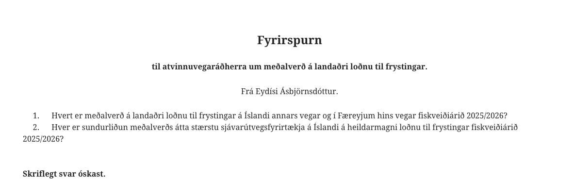 Hér er mjög áhugaverð fyrirspurn frá Eydísi Ásbjörnsdóttur um loðnuverðið. Innlenda verðið verður örugglega borið saman við það sem greitt var til grænlenskra útgerða og sömuleiðis hvað var greitt fyrir sömu loðnu í Færeyjum.