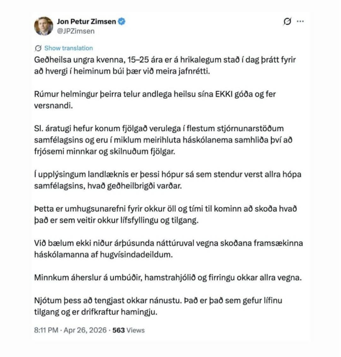 Jón Pétur Zimsen segir geðheilsu ungra kvenna á hrikalegum stað Fréttir Af Miðjan Þann 27. apríl 2026 Síðast uppfært 27. apríl 2026