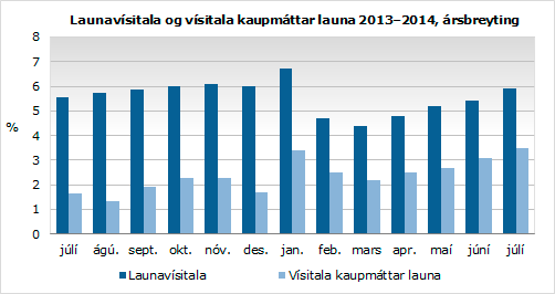 Vísitala kaupmáttar launa í júlí 2014 er 117,8 stig og hækkaði um 0,6% frá fyrri mánuði. Síðustu tólf mánuði hefur vísitala kaupmáttar launa hækkað um 3,5%.