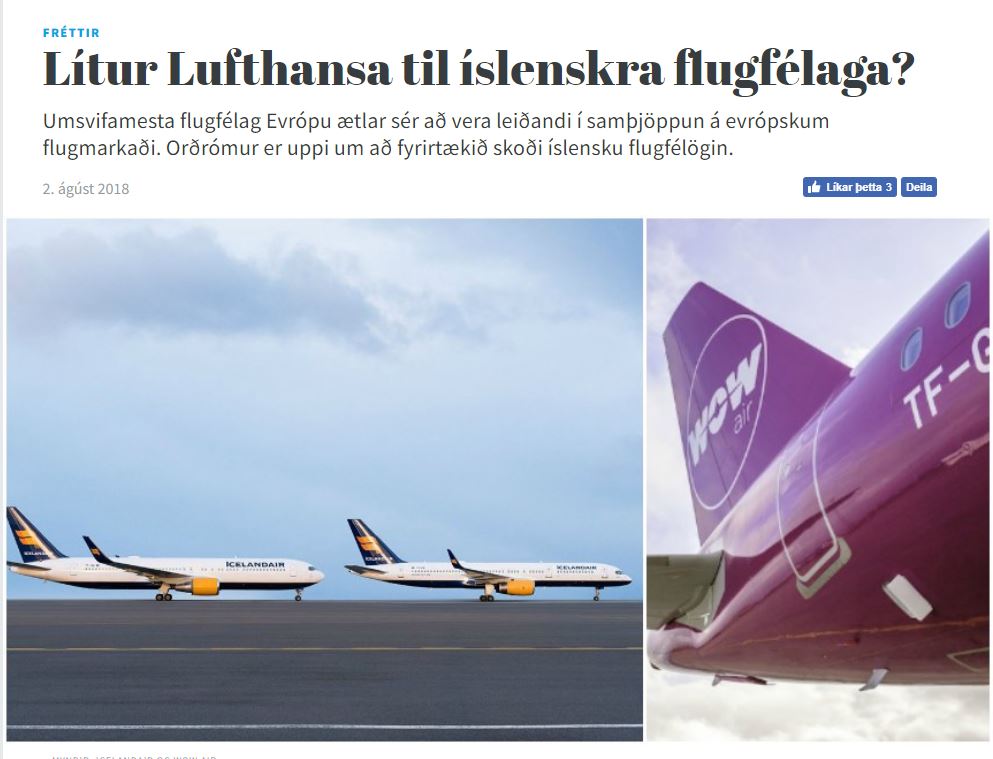 Lufthansa bíður bráðarinnar Umsvifamesta flugfélag Evrópu ætlar sér að vera leiðandi í samþjöppun á evrópskum flugmarkaði. Orðrómur er uppi um að fyrirtækið skoði íslensku flugfélögin. Fréttir Af Miðjan Þann 2. ágúst 2018 Verða miklar breytingar á rekstri íslensku flugfélaganna? Sjá turisti.is. Ferðaþjónuta