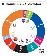 Samkvæmt könnun Fréttablaðsins, sem gerð var í gær og fyrradag, eru Viðreisn og Björt framtíð bæði utan þings en Miðflokkur Sigmundar Davíðs og Flokkur fólksins, Inga Sæland inni. Miðað við síðustu könnun Fréttablaðsins hefur fylgið sogast til Miðflokksins annars vegar (tæp níu prósentustig) og til vinstri (rúm fimm prósentustig til bæði VG og Samfylkingar). Björt framtíð, Framsókn og Flokkur fólksins hafa öll misst frá sér um fimm prósentustig en Píratar og Viðreisn um tvö. Sjálfstæðisflokkurinn stendur í stað.