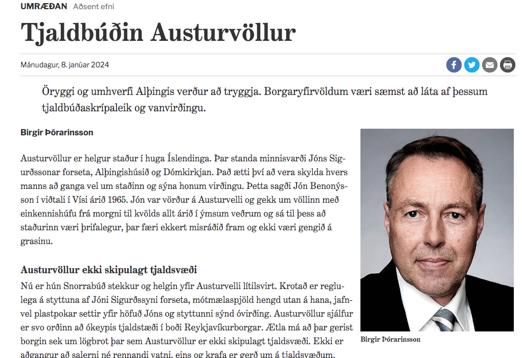 Stjórnmál „Austurvöllur sjálfur er svo orðinn að ókeypis tjaldstæði í boði Reykjavíkurborgar. Ætla má að þar gerist borgin sek um lögbrot þar sem Austurvöllur er ekki skipulagt tjaldsvæði. Ekki er aðgangur að salerni né rennandi vatni, eins og krafa er gerð um á tjaldsvæðum. Reykjavíkurborg veitir engu að síður leyfi fyrir tjöldum og þá ber henni að greiða gistináttaskatt. Viðbúið er að ferðamenn sem greiða fyrir gistingu í Laugardal og heimilislausir Íslendingar sem þar leita skjóls muni von bráðar færa sig niður á Austurvöll svo þeir þurfi ekki að greiða fyrir gistinguna,“ segir í nýrri Moggagrein Birgis Þórarinssonar þingmanns Sjálfstæðisflokksins, áður Miðflokksins.