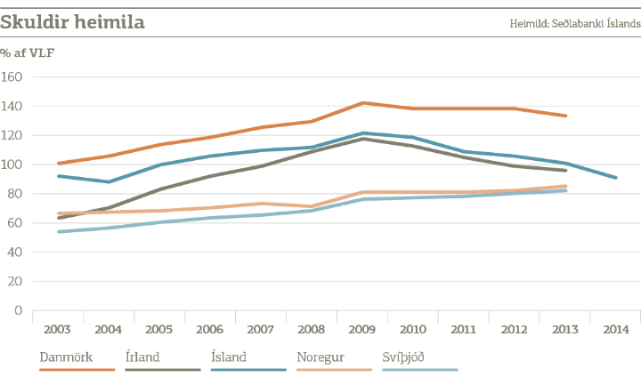 „Skuldir heimila í mörgum löndum jukust mikið í kringum fjármálakreppuna. Skuldaaukning hér á landi var þannig ekki úr korti miðað við aðrar þjóðir, t.d. var þróunin álíka í löndum eins og Írlandi og Danmörku. Um mitt ár 2009 voru skuldir íslenskra heimila rúmlega 126% af vergri landsframleiðslu, en þá var hlutfallið mun hærra í Danmörku, svipað á Írlandi og mun lægra í Noregi og Svíþjóð. Síðan þá hefur skuldahlutfallið lækkað mikið hér og á Írlandi, staðið í stað í Danmörku en hækkað áfram í Noregi og Svíþjóð. Skuldir íslenskra heimila hafa lækkað um 35 prósentur í hlutfalli við landsframleiðslu og hefur þróunin verið svipuð á Írlandi.“