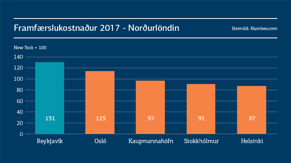 Merkar upplýsingar er að sjá í Hagsjá Landsbankans. Þar kemuir fram að þegar litið er til framfærslukostnaðar höfuðborga Norðurlandanna að Reykjavík er langdýrasta borg Norðurlanda, og hafa hún og Osló nokkra sérstöðu. „Sé miðað við New York eru Reykjavík og Osló mun hærri en í hinum borgunum þremur er framfærslukostnaður lægri en í New York,“ segir þar.
