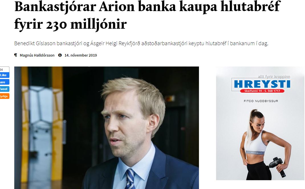 Katrín Baldursdóttir skrifar: „Hvað er í gangi hérna? Hvar fá bankastjórar Arion banka 223 milljónir til að kaupa hlutabréf í bankanum? Er sama sukkið byrjað og fyrir hrun? Er bankinn að lána bankastjórunum svo þeir geti keypt hlutabréfin? Og af hverju eru þeir að kaupa núna? Stendur bankinn svona illa að allt stefnir í óefni nema keypt séu hlutabréf? Og hvaða félög eru tengd þessum kaupum? Það er einhvern skítalykt af þessu máli.“