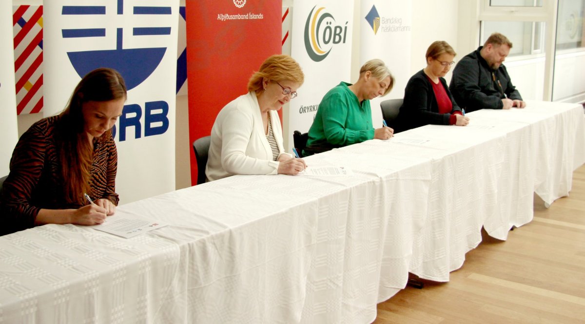 „Það er mér og því fólki sem ég er í forsvari fyrir gríðarlega mikilvægt að fá stuðning frá þessum öflugu samtökum launafólks,“ segir Þuríður Harpa Sigurðardóttir, formaður Öryrkjabandalagsins, en í dag undirrituðu Þuríður Harpa Sigurðardóttir, formaður ÖBÍ, Drífa Snædal, forseti ASÍ, Sonja Þorbergsdóttir, formaður BSRB, Þórunn Sveinbjarnardóttir, formaður BHM og Ragnar Þór Pétursson, formaður KÍ, yfirlýsingu og kröfur um bættan hag öryrkja. Yfirlýsingin og kröfurnar sem þessi stærstu samtök launafólks taka nú formlega undir með ÖBÍ.