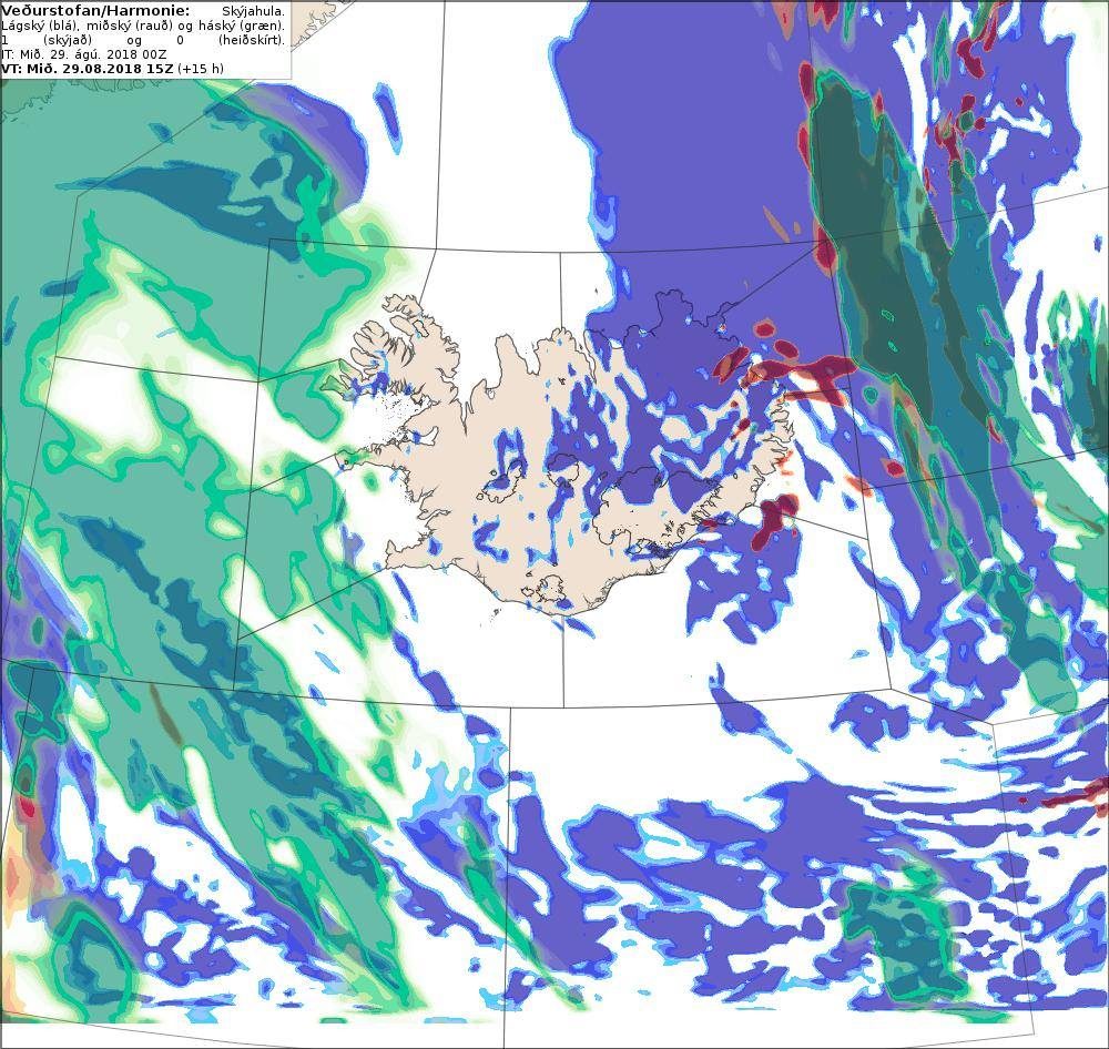Með fylgir spákort Harmonie Veðurstofunnar um skýjahulu, há-, mið- og lágskýja yfir landinu í dag kl. 15.