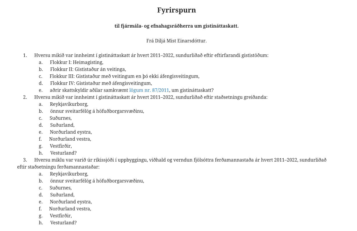 Diljá Mist Einarsdóttir fellur frá þremur fyrirspurnum. Hér að neðan má sjá eina af þremur fyrirsprunum sem Diljá Mist hefur fallið frá. Þetta greinila hin besta fyrirspurn.