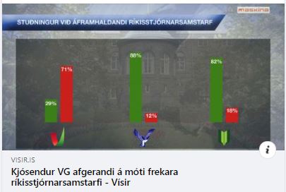 „Rúm sjötíu prósent kjósenda Vinstri grænna eru mótfallin áframhaldandi ríkisstjórnarsamstarfi VG, Sjálfstæðisflokks og Framsóknarflokks eftir alþingiskosningar 25. September… Aðeins tæpur þriðjungur, eða 29 prósent, kjósenda VG er fylgjandi frekara samstarfi.“