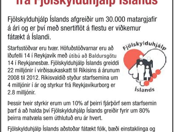 Þar er þess getið að Fjölskylduhjálpin greiddi 22 milljónir króna í virðisaukaskatt á árunum 2008 til 2012. Og að ríkið styrki Fjölskylduhjálpina um fjórar milljónir í ár og borgin um 2,8 milljónir.