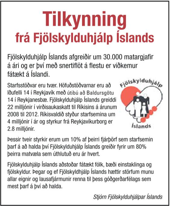Samfélag „Þegar og ef Fjölskylduhjálp Íslands hættir störfum munu allar eignir og lausafjármunir renna til þess góðgerðarfélags sem mest þarf á því að halda.“ Þetta eru lokaorð tilkynningar sem Fjölskylduhjálp Íslands birti í Fréttablaðinu í dag.